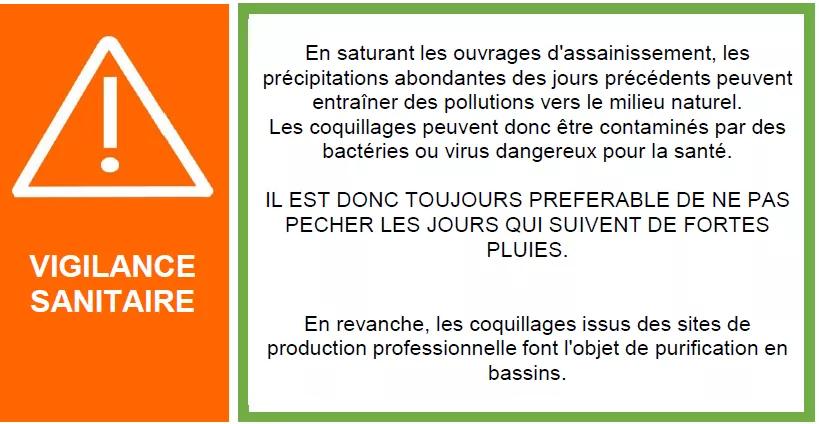 Il est préférable de ne pas pêcher de coquillages dans les 48 heures qui suivent de fortes pluies en raison du risque possible de dégradation de la qualité du milieu.