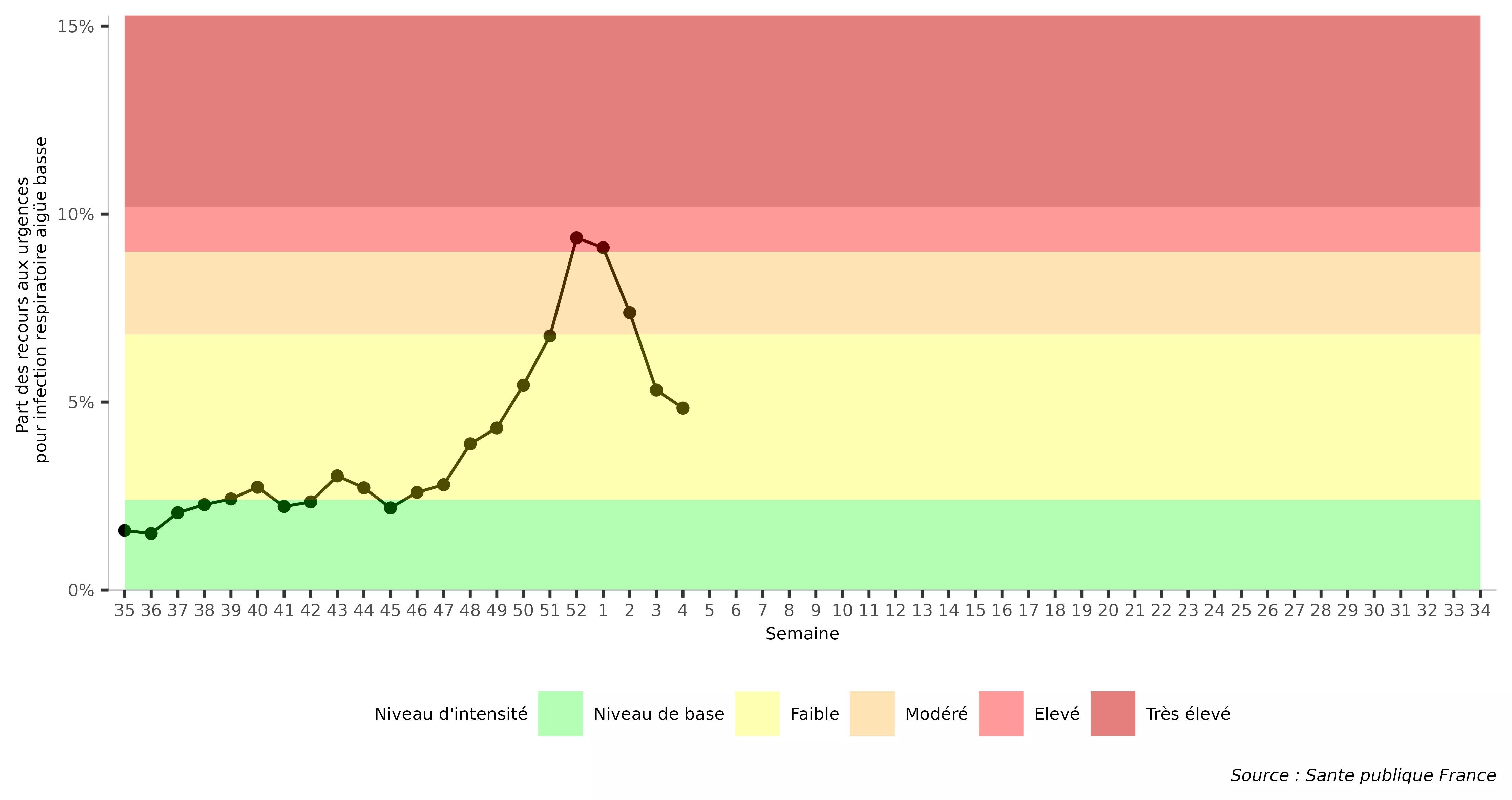 Évolution hebdomadaire de la part des infections respiratoires aiguës basses parmi les passages aux urgences