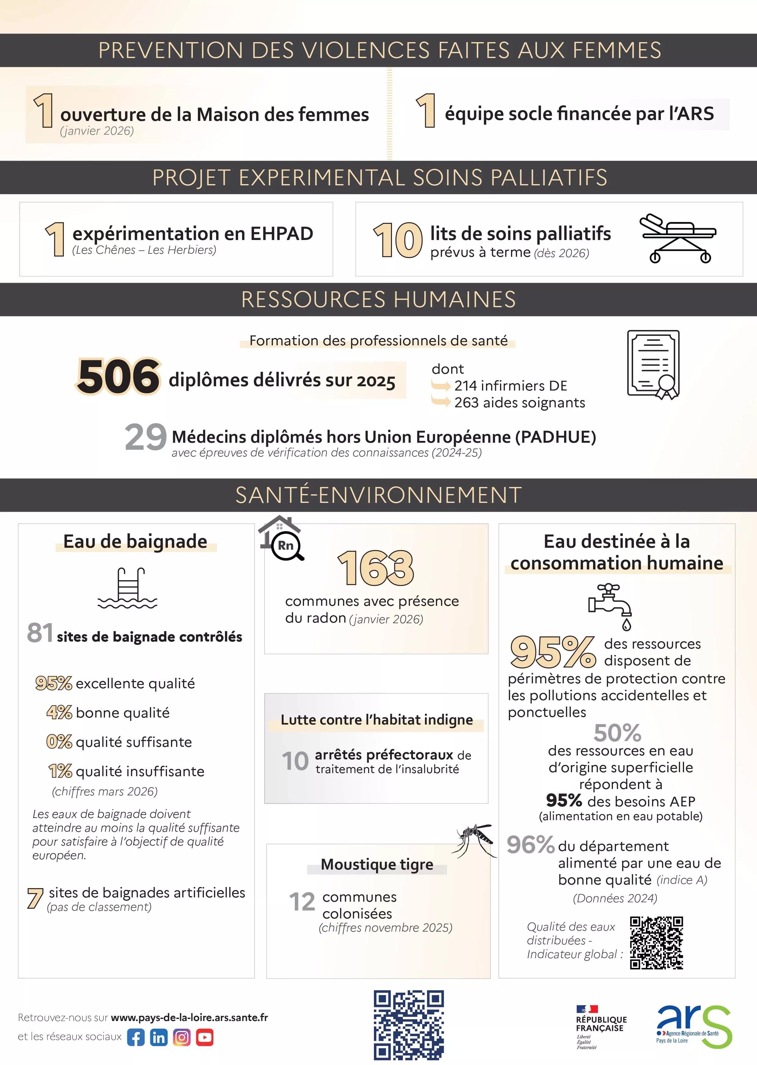 Infographie de la délégation territoriale de Vendée (ARS Pays de la Loire) présentant les repères et données clés en santé pour l’année 2025. Elle est organisée en plusieurs thématiques.