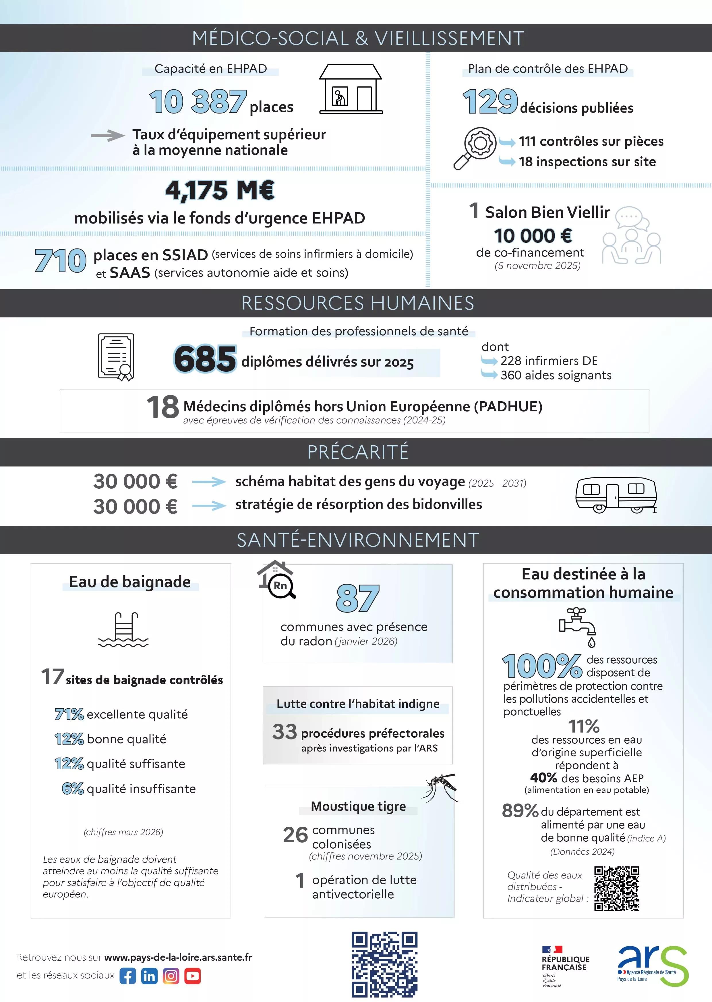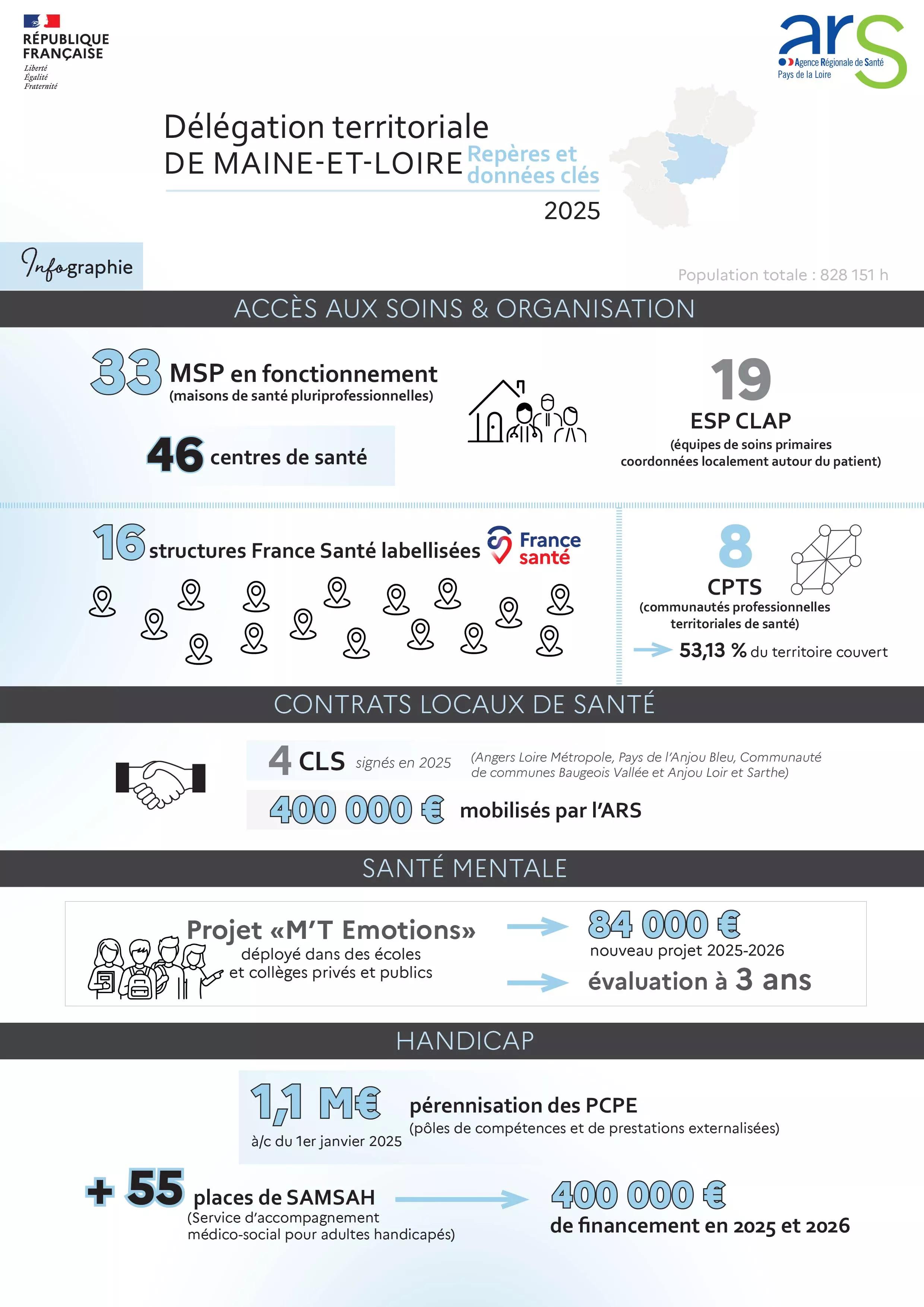 Infographie de la délégation territoriale du Maine-et-Loire (ARS Pays de la Loire) présentant les repères et données clés pour l’année 2025. Elle est organisée en plusieurs thématiques.