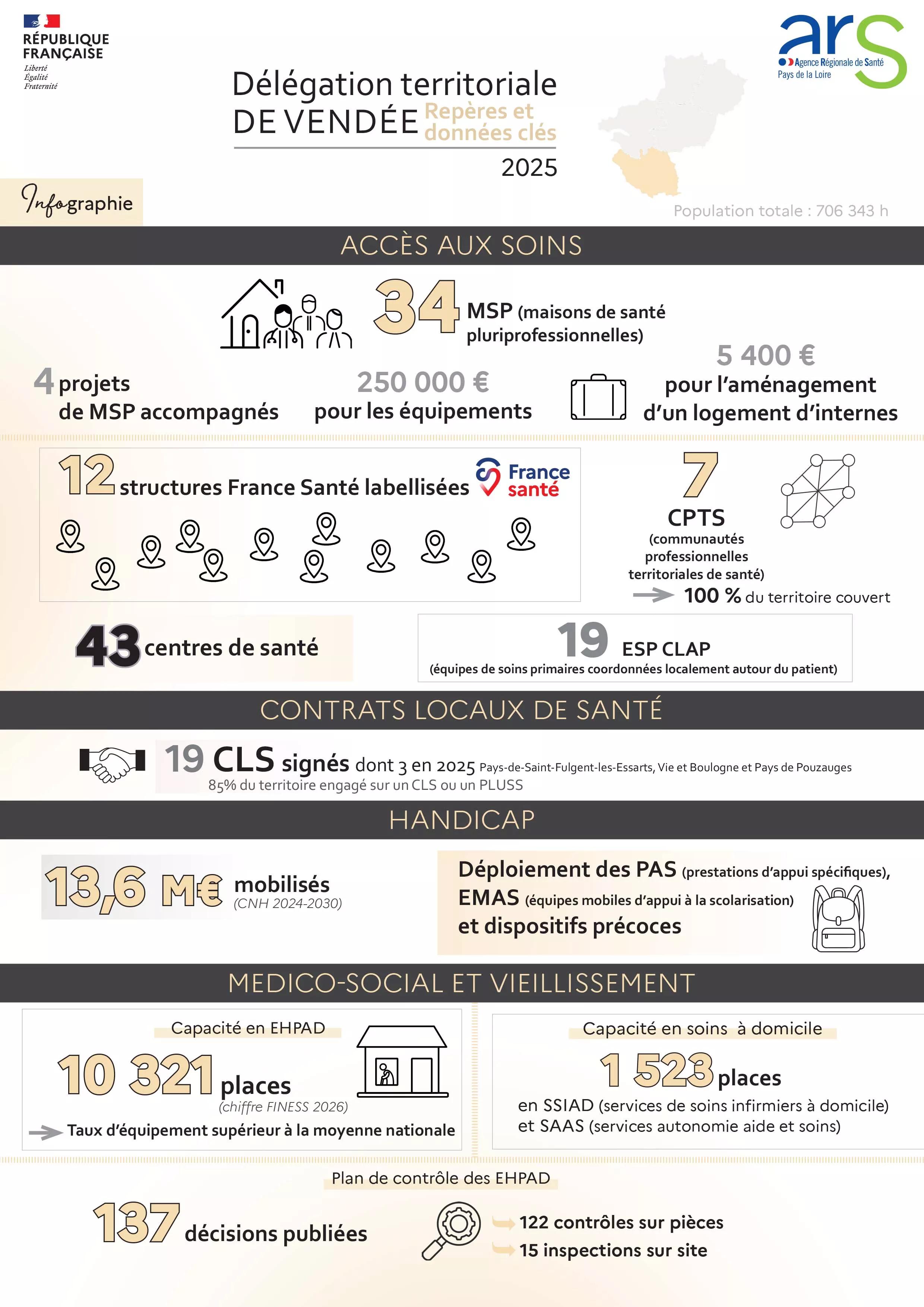 Infographie de la délégation territoriale de Vendée (ARS Pays de la Loire) présentant les repères et données clés en santé pour l’année 2025. Elle est organisée en plusieurs thématiques.